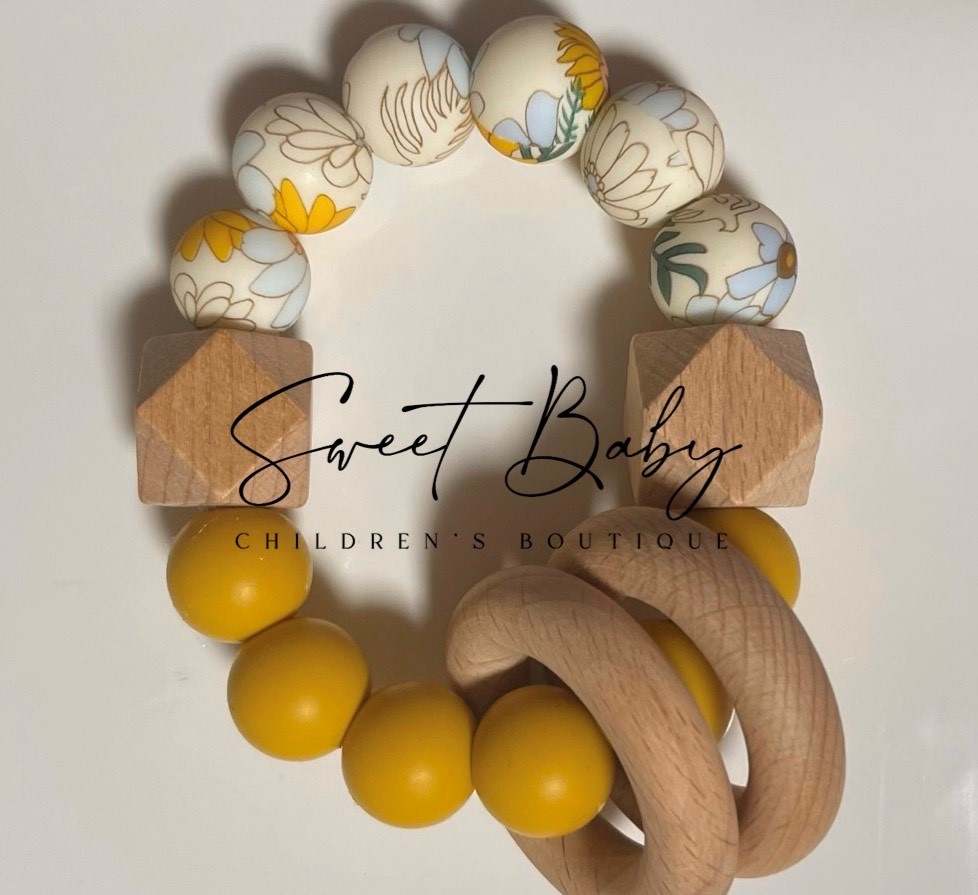 This lovely little toy ring is the perfect toy for infants and toddlers, and a great gift for baby showers. The 15MM silicone beads are used to help soothe babies when their teeth are starting to develop, and the 18MM hexagon wood beads are used to help the teeth come through the gums. The rings on these toys are a nice little touch because it is also used as a rattle. Got a new little one in the family? This is the perfect gift for you!