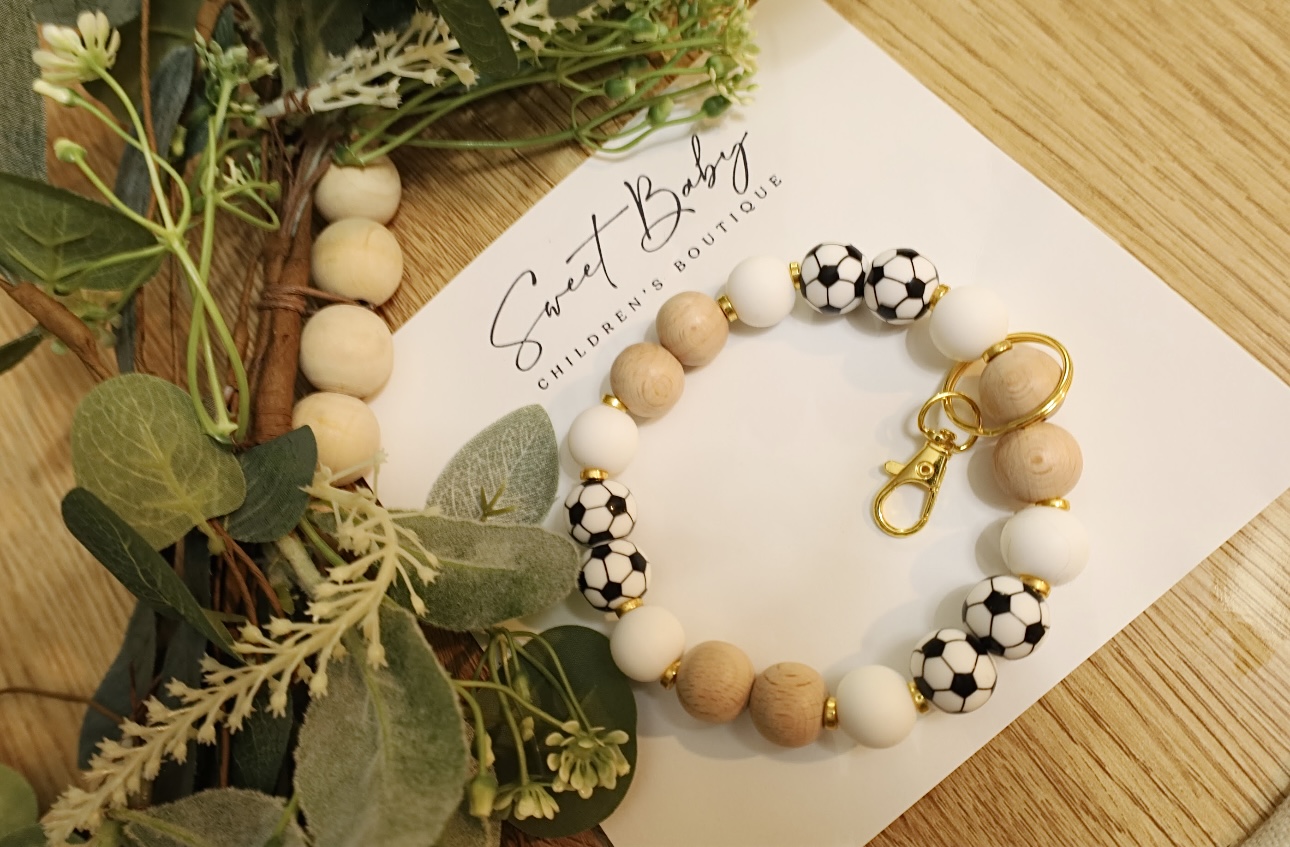 Materials used: Wristlets are made with BPA free 15mm silicone print beads, beechwood abacus spacer beads, & lobster claw clasp with a key ring.